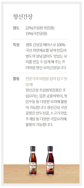 향신간장은 염도가 조림찜볶음용은 22%, 국전골용은 15%입니다. 샘표 간장을 베이스로 100% 국산 자연재료를 달여 만들어 별도의 양념 없이도 맛있는 요리를 만들 수 있는 프리미엄 향신 요리간장입니다. 조림찜볶음용은 궁중떡볶이, 볶음우동 등 다양한 요리에, 국전골용은 만두전골, 소고기국밥, 조개탕 등 국물요리에 활용할 수 있습니다.