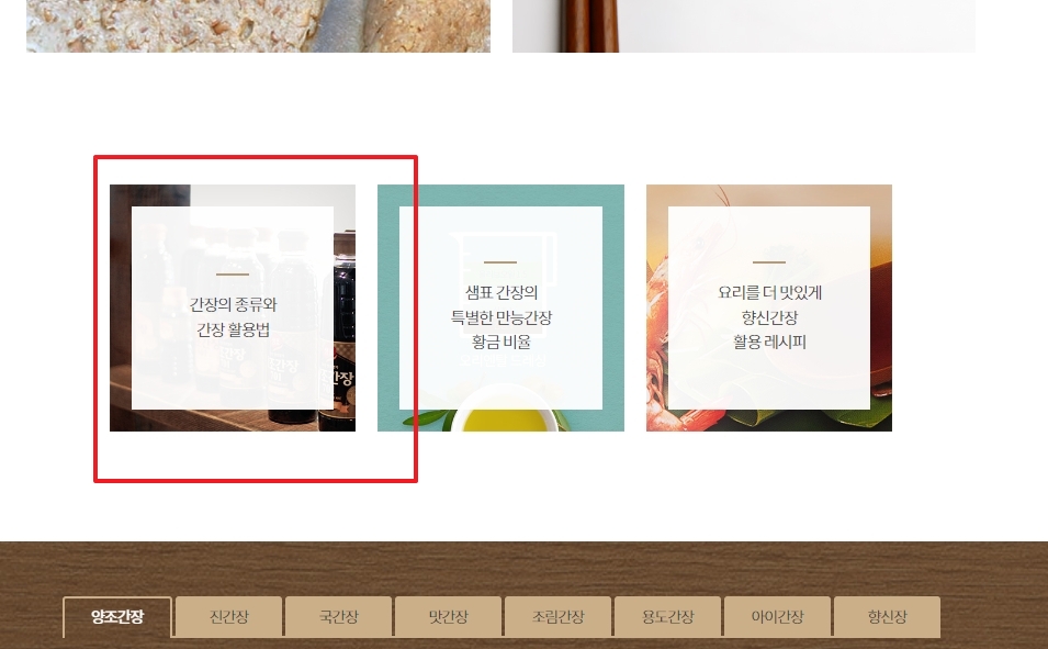 페이지가 이동하면 화면 아래로 내려서 간장의 종류와 간장 활용법 메뉴를 찾아 클릭합니다.