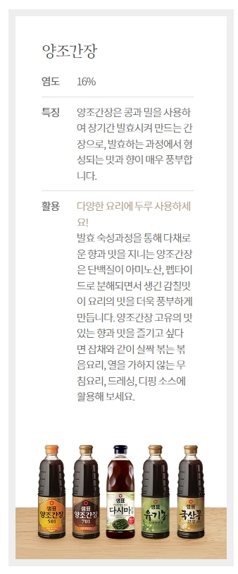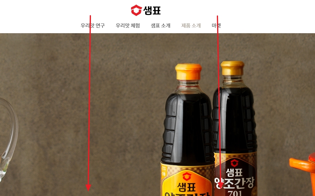 상단의 메뉴에서 제품소개를 클릭한 후 샘표간장을 선택합니다