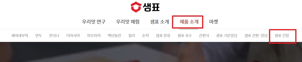 상단의 메뉴에서 제품소개를 클릭한 후 샘표간장을 선택합니다