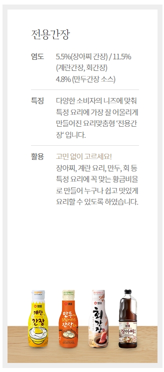 전용간장은 염도가 장아찌 간장은 5.5%, 계란간장과 회간장은 11.5%, 만두간장 소스는 4.8%입니다. 특정 요리에 맞춰 만들어진 요리 맞춤형 전용 간장으로, 장아찌, 계란 요리, 만두, 회 등 특정 요리에 적합한 황금비율로 누구나 쉽게 맛있게 요리할 수 있도록 만들어졌습니다.