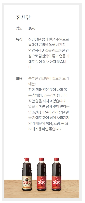 진간장은 염도가 16%이며, 콩과 밀을 주원료로 특화된 공법을 통해 시간적, 영양학적 손실을 최소화한 간장입니다. 풍부한 감칠맛이 필요한 요리에 적합하며, 열을 가해도 향과 맛이 변하지 않아 볶음, 조림, 찜 요리에 사용하면 좋습니다.