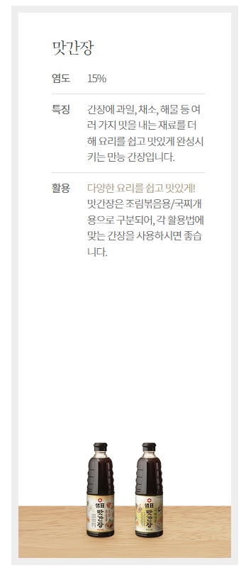 맛간장은 염도가 15%로, 간장에 과일, 채소, 해물 등 여러 가지 맛을 내는 재료를 더해 요리를 쉽고 맛있게 완성시키는 만능 간장입니다. 조림볶음용과 국찌개용으로 구분되어 있으며, 각 활용법에 맞는 간장을 사용하면 좋습니다.