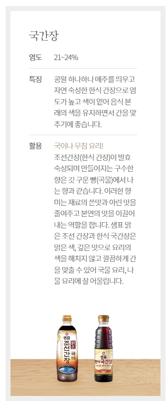 국간장은 염도가 21~24%로, 콩알 하나하나 메주를 띄우고 자연 숙성한 한식 간장입니다. 염도가 높고 색이 옅어 음식 본래의 색을 유지하면서 간을 맞추기에 좋습니다. 국물 요리, 나물 요리에 잘 어울리며, 구수한 향이 재료의 쓴맛과 아린 맛을 줄여주고 본연의 맛을 이끌어냅니다.