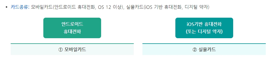 카드 종류는 모바일카드와 실물카드로 나뉩니다. 모바일카드는 안드로이드 휴대전화(OS 12 이상)에서 사용할 수 있으며, 실물카드는 iOS 기반 휴대전화 또는 디지털 약자에게 적합합니다.