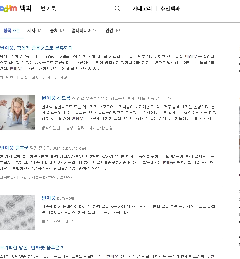 번아웃을 검색하면 여러 관련 항목이 나옵니다. 몇 가지를 읽어보면 번아웃의 개념을 쉽게 이해할 수 있습니다.