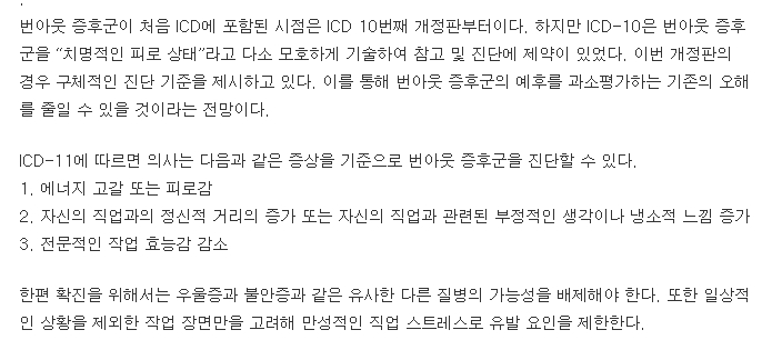 과학향기에 따르면 세계보건기구(WHO)는 번아웃을 직업적으로 발생할 수 있는 증후군으로 분류했습니다. 번아웃 증후군은 특정 원인보다는 여러 요인에 의해 발생하는 증상으로, ICD-11에 공식 등재되어 직업적 증후군으로 분류됩니다. 이는 질병이 아니기 때문에 의료기관에서 공식 치료와 관리를 받지는 않습니다.