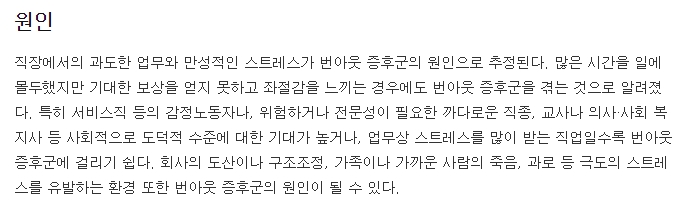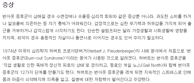 번아웃(Burn-out)은 타버리다라는 뜻으로, 정신적·신체적 피로로 인해 무기력해지는 증상을 말합니다. 다른 말로는 탈진 증후군 또는 소진 증후군 등으로 불리며, 우울증과 증상이 유사합니다. 한 가지 일에 몰두하다가 갑자기 에너지가 소진되면 업무 적응이 어려워집니다.