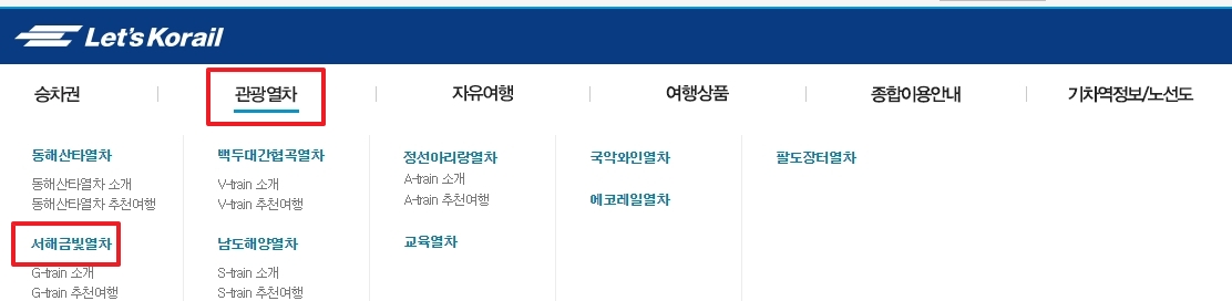 상단의 메뉴에서 관광열차를 선택하고, 서해금빛열차를 클릭합니다. 관광열차 메뉴에서는 여러 종류의 관광열차를 확인할 수 있으며, 서해금빛열차는 그 중 하나입니다.
