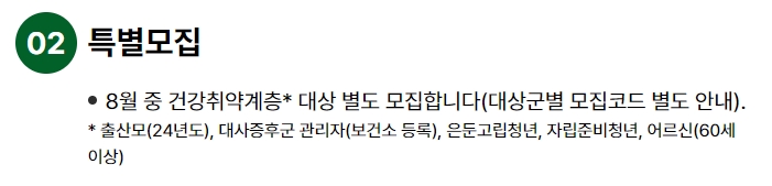 특별모집은 8월 중에 건강취약계층을 대상으로 별도로 모집합니다. 건강취약계층에는 출산모, 대사증후군 관리자(보건소 등록), 은둔고립청년, 자립준비청년, 어르신(60세 이상)이 포함됩니다. 대상군별 모집코드가 별도로 안내됩니다.