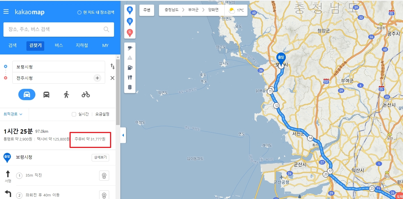주유비 정보를 확인합니다. 카카오맵에서 제공하는 주유비 정보는 사용자가 차량 이동에 드는 비용을 대략적으로 계산하는 데 도움을 줍니다.