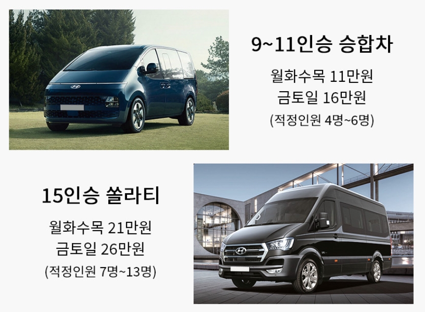 5. 대부분의 승합차는 9~11인승이라서 15인승이 아닐 수 있어요. 그래서 15인승 쏠라티를 빌리려면 21만원에 추가요금을 더해서 22만원이 되는 거예요. 이 요금은 월요일부터 목요일까지고, 금요일부터 일요일까지는 27만원이에요.