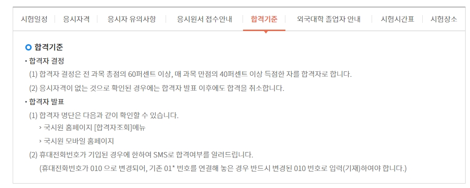 6. 합격 기준을 보면, 전 과목 총점의 60% 이상, 매 과목 만점의 40% 이상 득점한 자가 합격자로 결정됩니다. 응시 자격이 없는 것으로 확인된 경우에는 합격자 발표 이후에도 합격이 취소될 수 있습니다. 합격자 명단은 국시원 홈페이지의 [합격자조회] 메뉴나 국시원 모바일 홈페이지에서 확인할 수 있으며, 휴대전화번호가 기입된 경우 SMS로도 합격 여부를 알려줍니다.