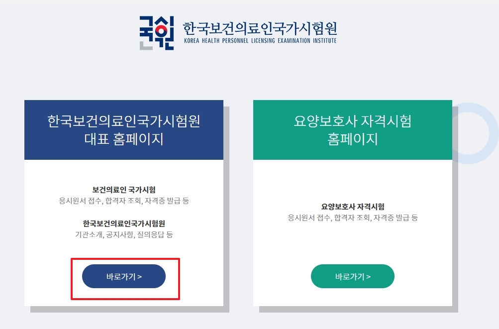 1. 한국보건의료인 국가시험원 홈페이지로 들어갑니다. 이 사이트는 보건의료인 국가시험을 주관하는 곳으로, 시험 정보, 원서 접수, 합격 조회, 자격증, 면허 발급 등 다양한 정보를 제공합니다.