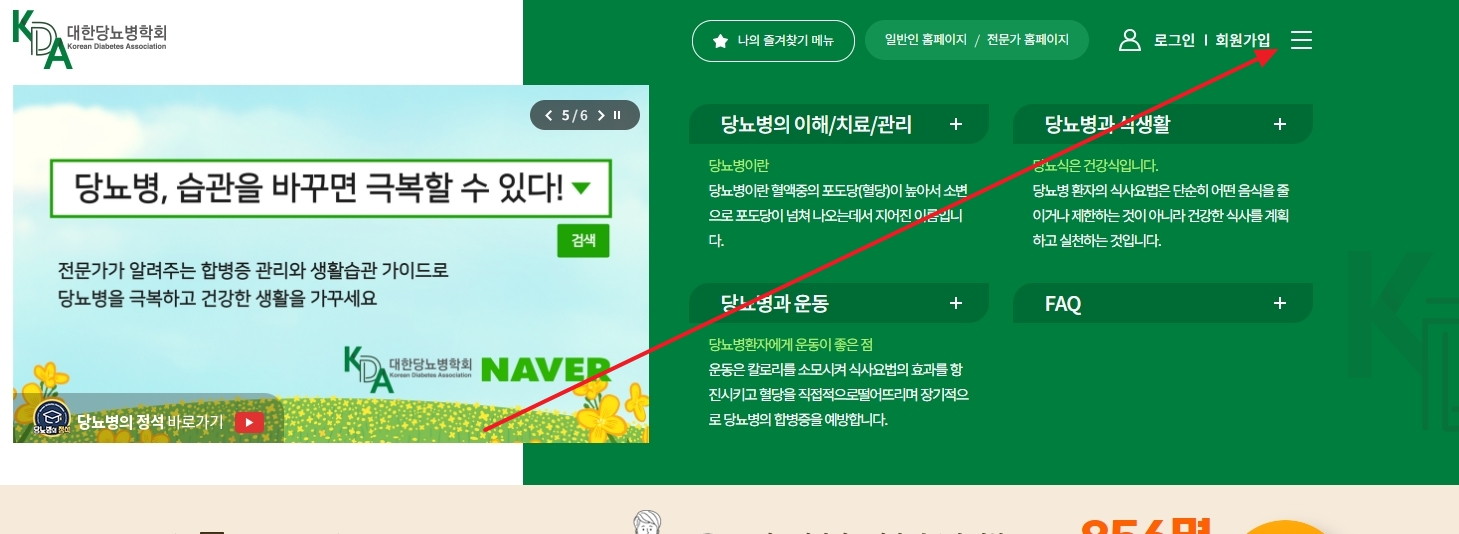 1. 먼저 대한당뇨병학회 홈페이지로 들어갑니다. 이곳은 당뇨병 관련 정보와 함께 하루 권장 칼로리를 계산하는 도구와 방법을 제공하는 곳입니다.