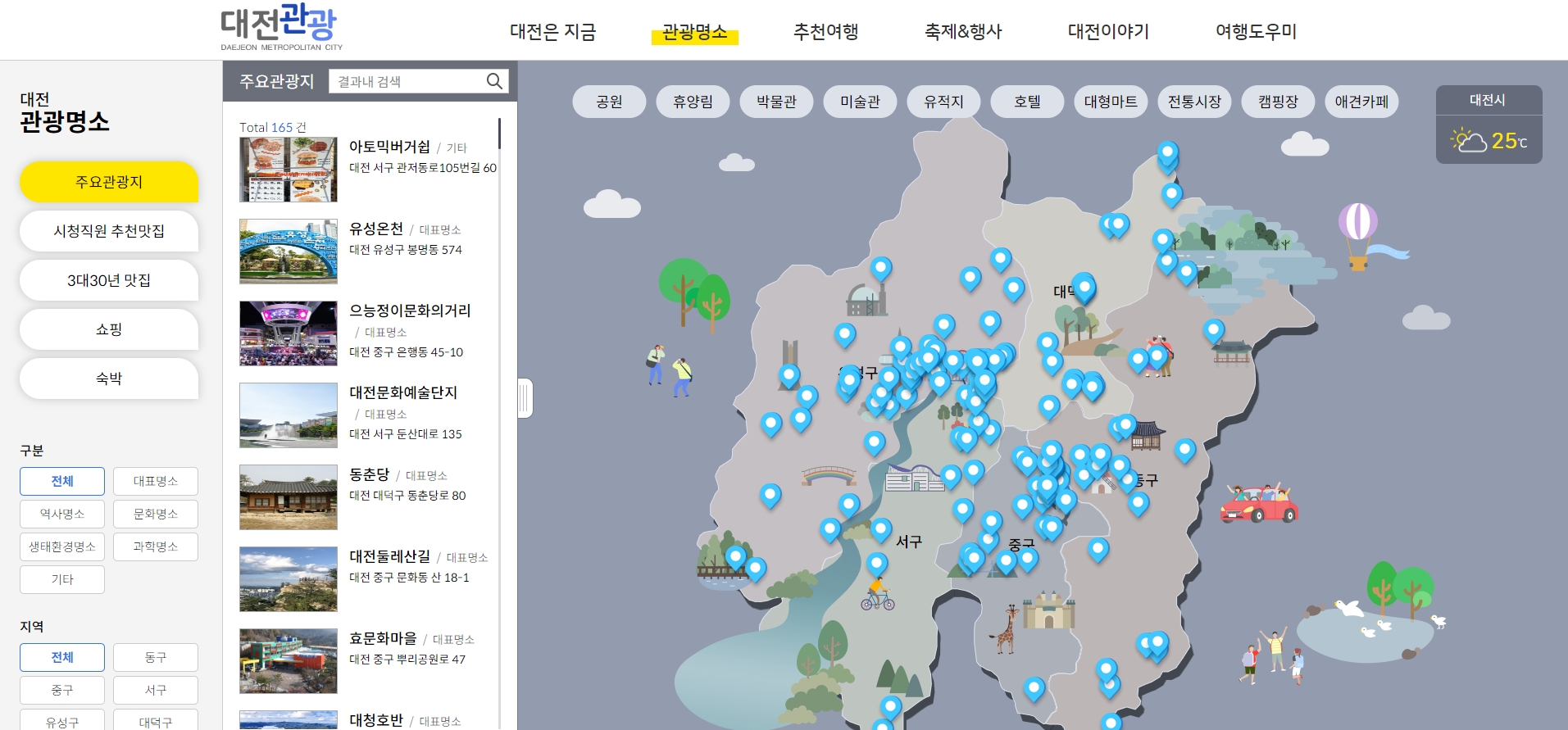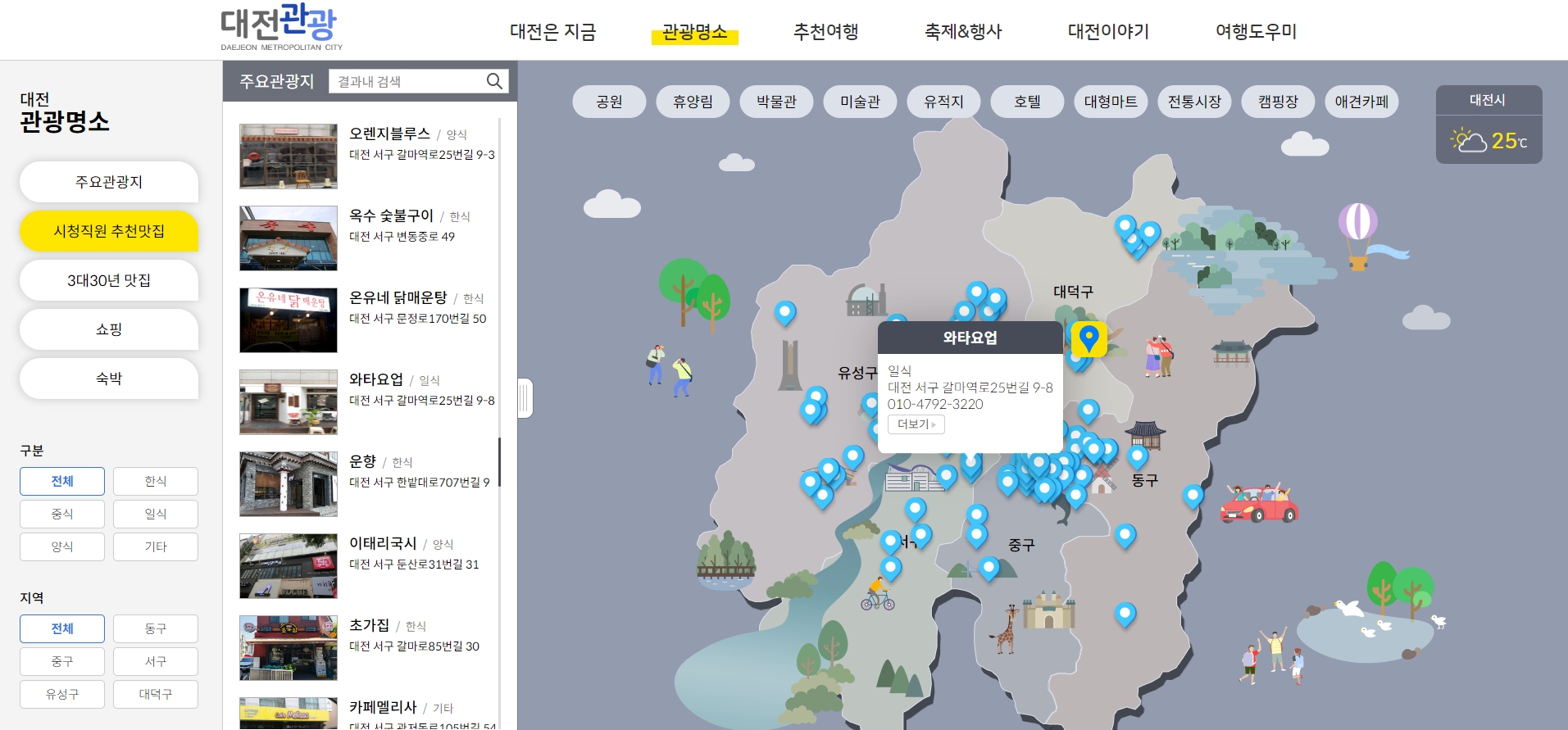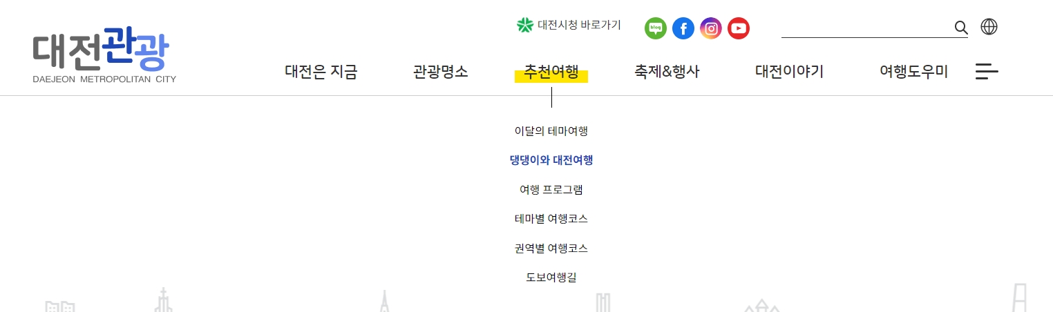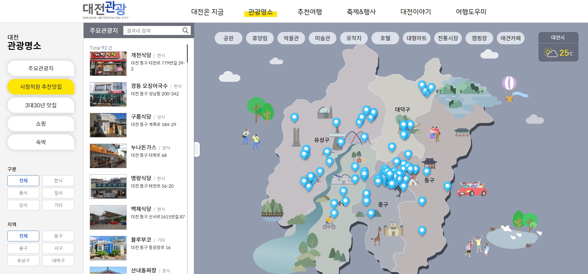 2. 홈페이지 상단의 메뉴에서 관광명소와 주요관광지, 그리고 대전시청 직원 추천맛집 두 가지를 살펴볼 거예요. 이 두 가지 메뉴에서 좋은 여행지와 맛집 정보를 찾을 수 있어요.