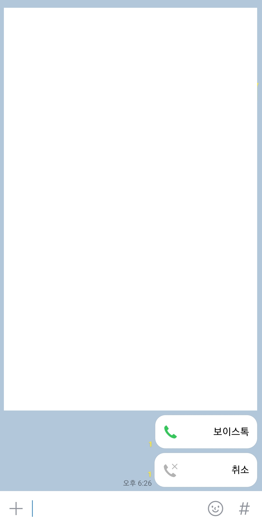 7. 상대방이 전화를 받지 않아서 내가 전화를 끊으면 부재중 통화 표시가 채팅방에 남아요. 만약 통화를 했다면 통화 시간도 채팅방에 표시돼요. 이렇게 해서 보이스톡 통화 내역을 확인할 수 있어요.