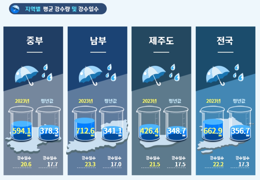 2. 2023년에는 중부 지역에서 594.1mm의 강수량이 있었으며, 평균 강수일수는 20.6일이었습니다. 남부 지역은 712.6mm의 강수량과 23.3일의 강수일수를 기록했습니다. 제주는 426.4mm의 강수량과 21.5일의 강수일수를 보였습니다. 전국 평균으로는 662.9mm의 강수량과 22.2일의 강수일수가 기록되었습니다. 2023년 데이터를 바탕으로 2024년 장마도 비슷한 패턴을 보일 것으로 예상되며, 중부와 남부, 제주 모두 비슷한 기간과 강수량을 가질 가능성이 높습니다.