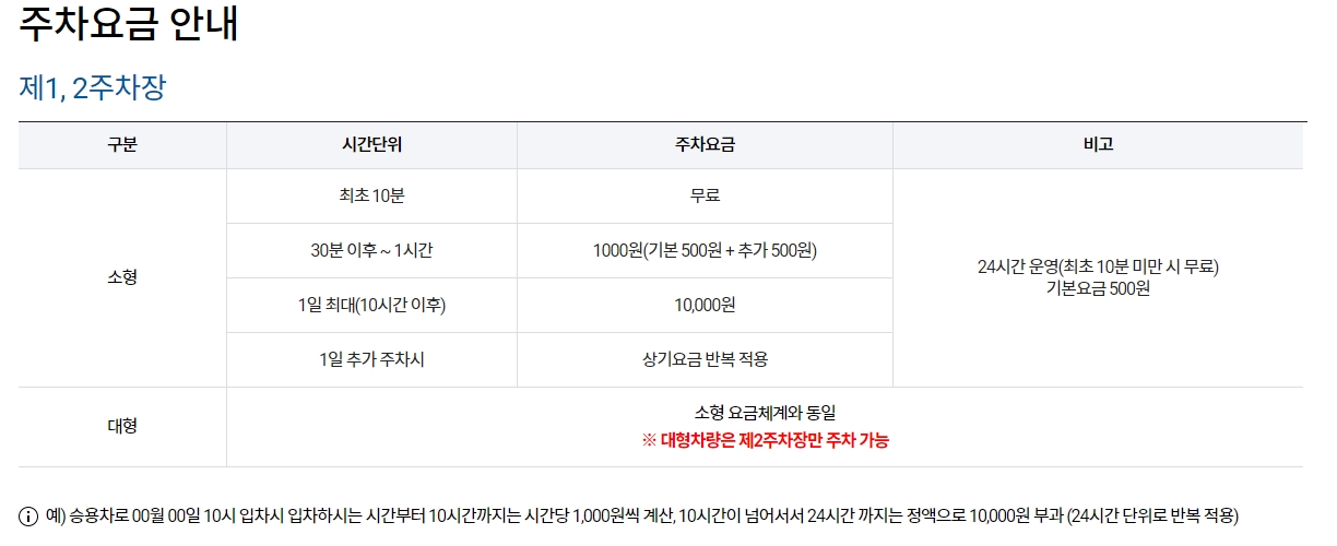 제1, 제2주차장은 24시간 운영되며, 최초 10분은 무료로 제공돼요. 소형 차량의 경우, 첫 10분 이후부터 30분까지는 기본 요금 500원이 부과돼요. 30분 이후부터 1시간까지는 추가 요금 500원이 더해져 총 1,000원이 부과돼요. 하루 최대 요금은 10시간 이후 10,000원이며, 1일 추가 주차 시 동일한 요금 체계가 반복 적용돼요. 대형 차량도 동일한 요금 체계를 따르지만, 제2주차장에만 주차할 수 있어요.