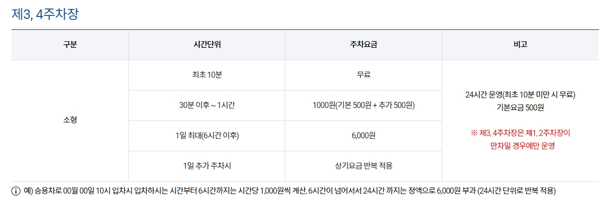 6. 제3, 4주차장은 제1, 2주차장이 만차일 경우에만 운영됩니다. 소형 차량의 경우 최초 10분 무료, 기본 요금은 500원, 30분 이후부터 1시간까지는 1,000원(기본 500원 + 추가 500원), 1일 최대 요금은 6,000원이며, 1일 추가 주차 시 상기 요금이 반복 적용됩니다. 예를 들어, 승용차로 00월 00일 10시에 입차 시 6시간까지는 시간당 1,000원씩 계산되며, 6시간 이후부터 24시간까지는 정액으로 6,000원이 부과됩니다. 24시간 단위로 반복 적용됩니다.
