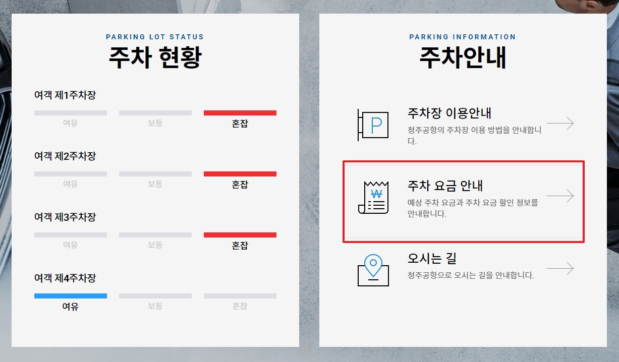 3. 주차안내 페이지로 이동하면 주차 요금 안내를 선택할 수 있습니다.