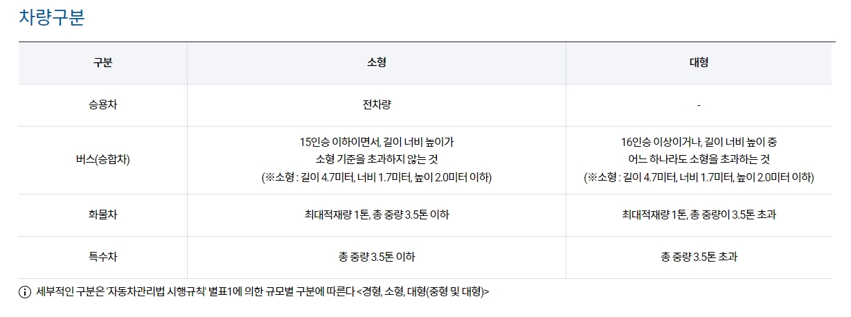 7. 차량 구분은 소형과 대형으로 나뉘며, 소형은 승용차 전 차량과 15인승 이하의 버스(승합차)로 길이 4.7미터, 너비 1.7미터, 높이 2.0미터 이하인 차량, 최대 적재량 1톤, 총 중량 3.5톤 이하의 화물차, 총 중량 3.5톤 이하의 특수차를 포함합니다. 대형은 16인승 이상의 버스(승합차) 또는 길이, 너비, 높이 중 하나라도 소형 기준을 초과하는 차량, 최대 적재량 1톤, 총 중량 3.5톤을 초과하는 화물차, 총 중량 3.5톤을 초과하는 특수차를 포함합니다. 세부적인 구분은 자동차관리법 시행규칙 별표 1에 따른 규모별 구분에 따릅니다.