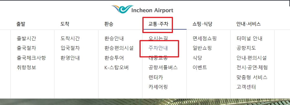2. 홈페이지 상단 메뉴에서 교통/주차를 선택한 후, 주차안내를 클릭합니다. 이 메뉴는 공항 내 주차 관련 정보를 제공하며, 주차 위치, 요금, 예약 방법 등을 상세히 안내합니다.