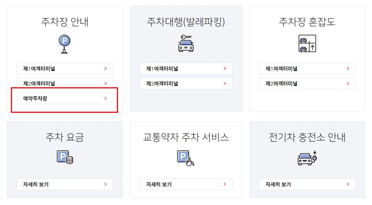 3. 주차안내 페이지로 이동하면 주차장 안내 섹션이 보입니다. 여기서 예약주차장을 클릭합니다. 예약주차장은 미리 주차 공간을 확보할 수 있는 서비스로, 공항을 이용하는 날 주차 문제를 걱정하지 않아도 되게 해줍니다.