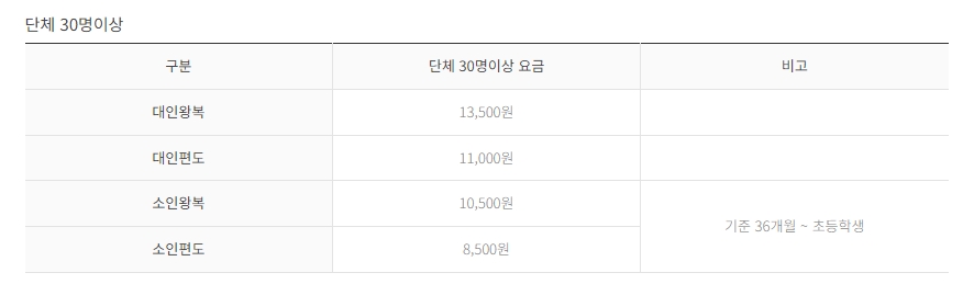 4. 단체 요금은 30명 이상일 때 적용됩니다. 대인의 경우, 왕복 요금은 13,500원, 편도 요금은 11,000원입니다. 소인의 경우, 왕복 요금은 10,500원, 편도 요금은 8,500원입니다.
