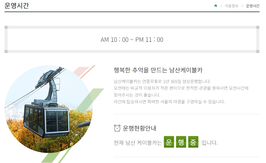 6. 운영시간은 오전 10시부터 오후 11시까지입니다. 남산 케이블카는 연중무휴로 1년 365일 정상 운행합니다. 오전에는 비교적 이용자가 적어 한적한 관광을 즐길 수 있으며, 야간에는 화려한 서울의 야경을 볼 수 있습니다. 현재 남산 케이블카는 정상 운행 중이며, 운행 여부는 홈페이지를 통해 확인할 수 있습니다.