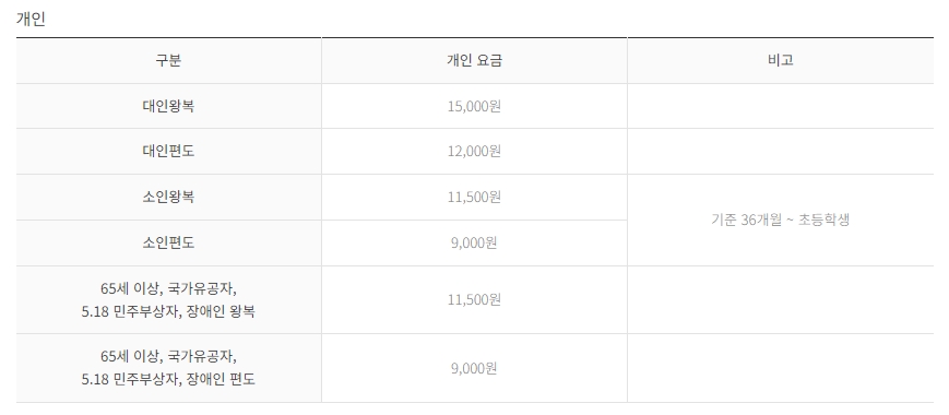 3. 개인 요금은 다음과 같습니다. 대인 왕복 요금은 15,000원이고, 편도 요금은 12,000원입니다. 소인의 경우, 왕복 요금은 11,500원, 편도 요금은 9,000원입니다. 소인은 36개월 이상부터 초등학생까지 해당합니다. 또한, 65세 이상, 국가유공자, 5.18 민주부상자, 장애인에 대한 할인 요금도 제공되며, 왕복 요금은 11,500원, 편도 요금은 9,000원입니다.