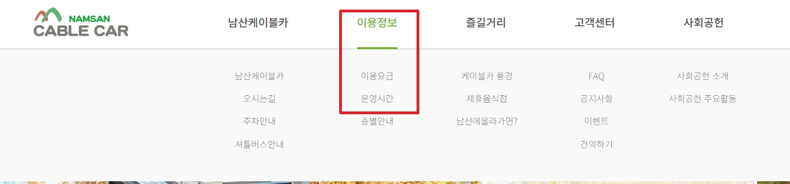 2. 상단 메뉴에서 이용정보를 클릭하고 이용요금과 운영시간을 확인합니다. 이 메뉴를 통해 남산 케이블카의 요금과 운영시간에 대한 자세한 정보를 얻을 수 있습니다.