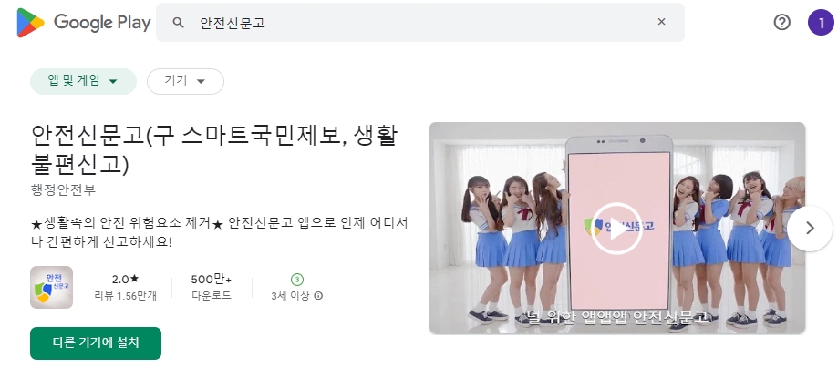 2. 검색창을 열고 안전신문고를 검색하여 해당 어플을 다운로드 받습니다. 예전의 이름은 생활불편신고였고 차라리 예전의 이름이 더 낫지 않나 생각을 합니다.