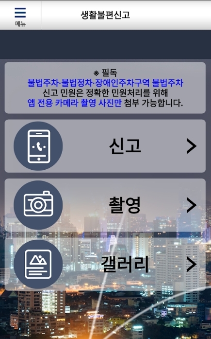 4. 현재는 사진과 같이 변경되었고 안전에 관련해서도 신고가 가능합니다. 생활속에서 불편한 것들이나 안전에 위협이 되는 것들을 신고하면 그 결과를 어플에서 볼 수 있습니다.