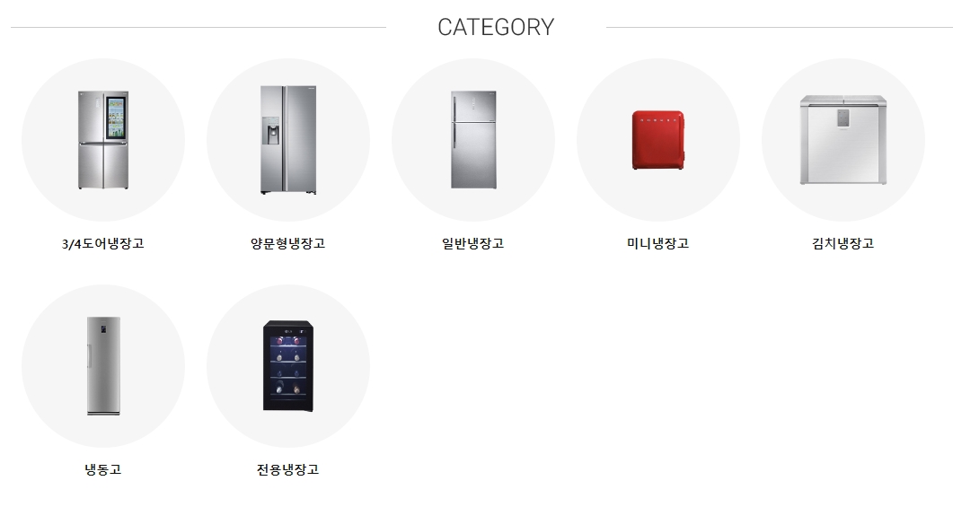 냉장고를 클릭해보니 나름 잘 구분 지어서 나누어 놓았습니다. 3도어, 4도어, 양문형, 김치냉장고, 미니 냉장고 등으로 구분되어 있고, 와인 전용 냉장고도 있습니다. 다양한 종류의 냉장고를 쉽게 비교할 수 있습니다.