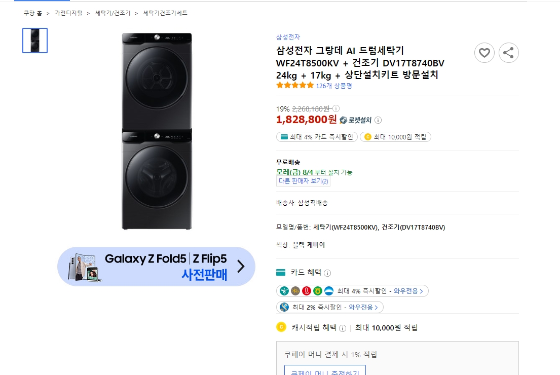 세탁기와 건조기 세트를 봤는데, 삼성의 그랑데와 LG의 워시타워가 보입니다. 두 브랜드의 인기 모델을 비교해볼 수 있습니다.