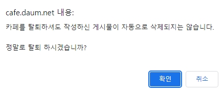 6. 탈퇴가 가능하다고 해도 게시물이 자동으로 삭제되지 않으며, 탈퇴 절차 중에 다시 한 번 확인을 요청합니다. 확인 버튼을 클릭하면 탈퇴 절차가 완료됩니다.