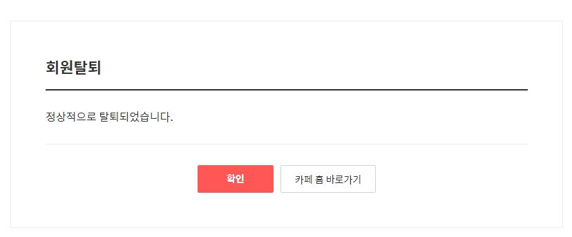 7. 그러면 페이지가 변환되며 정상적으로 탈퇴되었습니다라는 메시지가 표시됩니다. 이로써 탈퇴가 완료되며, 더 이상 해당 카페의 멤버가 아닙니다. 이와 같이 단계를 따라가면 다음 카페에서 쉽게 탈퇴할 수 있습니다. 각 단계에서 주의할 점을 유념하여 진행하면 됩니다.
