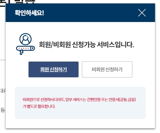 5. 발급하기 버튼을 클릭합니다. 비회원 신청하기를 클릭한 뒤 약관에 동의하고 정보를 입력합니다. 이후 다음 단계로 이동합니다.
