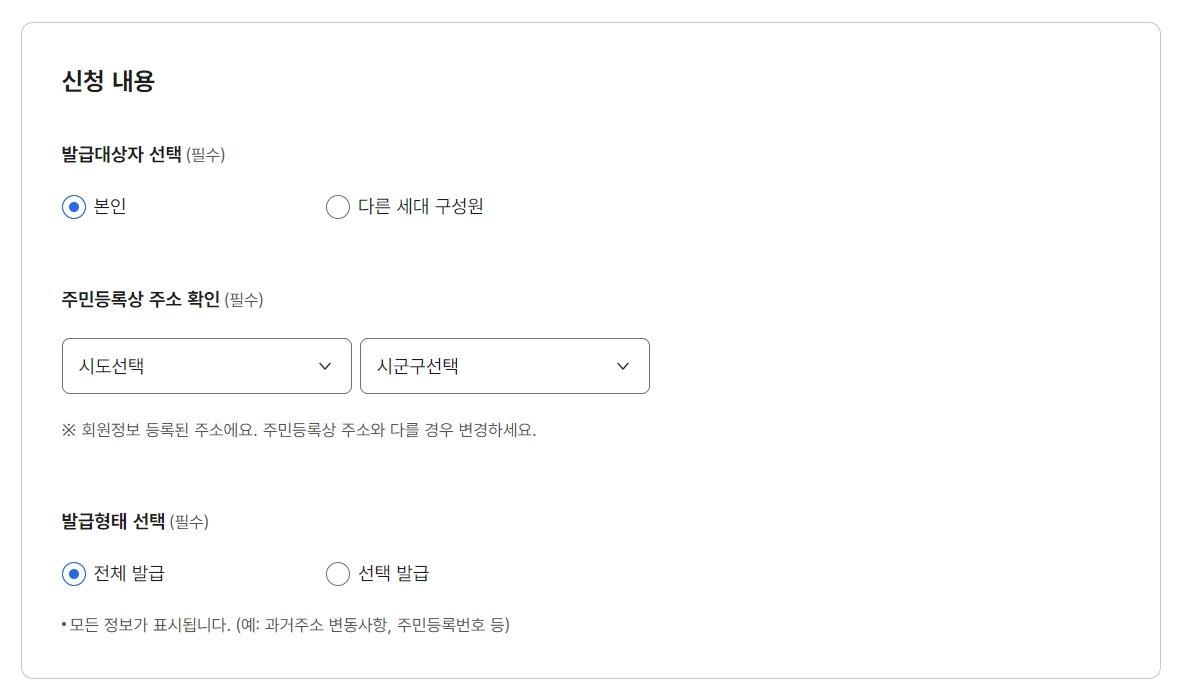 7. 신청 내용을 입력합니다. 발급대상자를 선택하는데, 본인 또는 다른 세대 구성원 중에서 선택합니다. 주민등록상 주소 확인을 위해 시도와 시군구를 선택합니다. 회원정보에 등록된 주소와 주민등록상 주소가 다를 경우 변경할 수 있습니다. 발급형태는 전체 발급 또는 선택 발급 중 선택할 수 있으며, 모든 정보가 표시됩니다(예: 과거주소 변동사항, 주민등록번호 등).