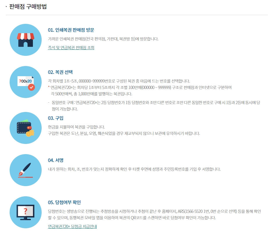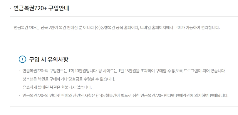 4. 연금복권은 전국의 복권 판매점, 동행복권 공식 홈페이지, 모바일 홈페이지에서 구매할 수 있습니다. 구입한도는 1회 10만원이며, 사이트 자체에서는 하루에 15만원을 초과하여 구매할 수 없습니다.