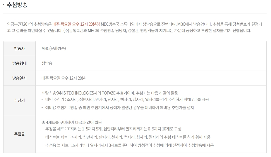 77. 연금복권의 추첨방송은 매주 목요일 오후 12시 20분에 진행됩니다. 시간은 변경될 수 있으므로 확인이 필요합니다.