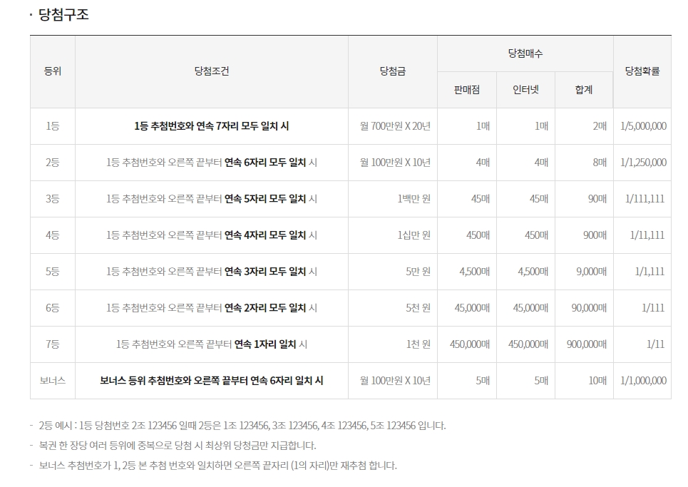5. 연금복권의 1등 당첨 확률은 500만 분의 1, 2등은 125만 분의 1입니다. 최근 연금복권의 개편으로, 일정 번호 조합을 모두 구매하는 방식을 택할 경우 실제 수령액이 증가할 수 있습니다.