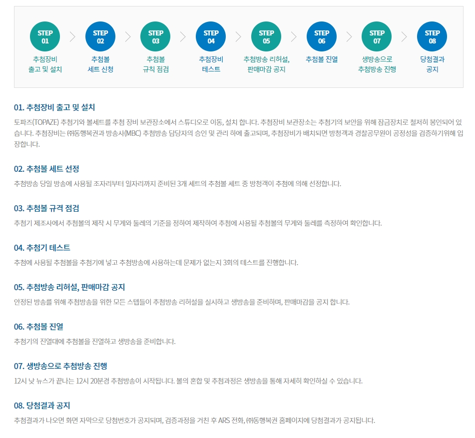 8. 추첨장비 출고, 설치 후 규격 점검과 테스트를 거치며, 리허설 후 실제 생방송으로 추첨방송이 진행됩니다.