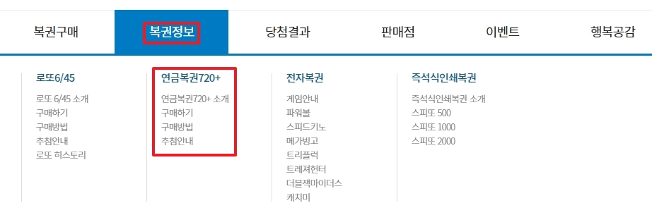 2. 홈페이지의 복권정보 섹션에서 연금복권 정보에 접근할 수 있습니다. 연금복권은 이전의 520에서 720으로 변경되었으며, 당첨금도 500만원에서 700만원으로 증가하였습니다.