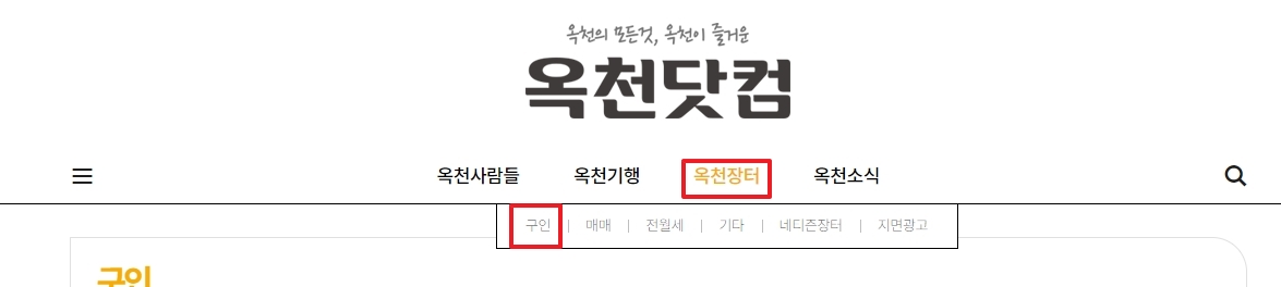 3. 옥천장터 메뉴를 클릭하면 옥천닷컴 홈페이지로 이동됩니다. 이동된 페이지의 상단 메뉴에서 옥천장터를 다시 클릭하고, 그 아래에 있는 구인 항목을 선택합니다.