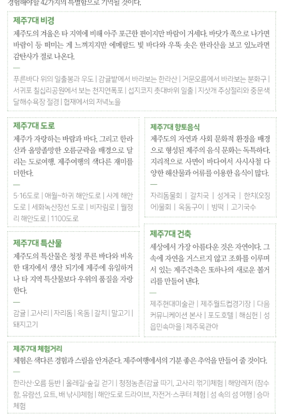 5. 제주 7대 도로, 향토음식, 특산물, 건축, 체험거리에 관한 정보도 제공되며, 특히 건축에 관심이 있다면 관련 명소를 방문하는 것이 좋습니다.