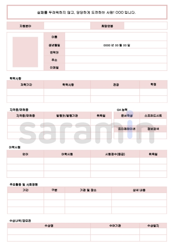 5. 사람인에서 제공하는 일부 이력서 양식은 디자인 요소가 많이 포함되어 있어, 전통적인 표 형식보다 덜 딱딱하고 시각적으로 매력적으로 보일 수 있습니다. 하지만, 이력서를 제출하는 곳의 선호도에 따라 이러한 형식의 이력서가 적합하지 않을 수도 있으니, 제출처의 요구사항을 고려하는 것이 좋습니다.