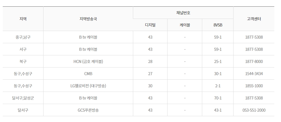 9. 대구 지역에서는 다른 지역에서는 보기 드문 27번 채널이 존재합니다. 대구 지역의 채널 번호는 다른 지역과 다르므로, 정확한 정보를 확인하는 것이 중요합니다.