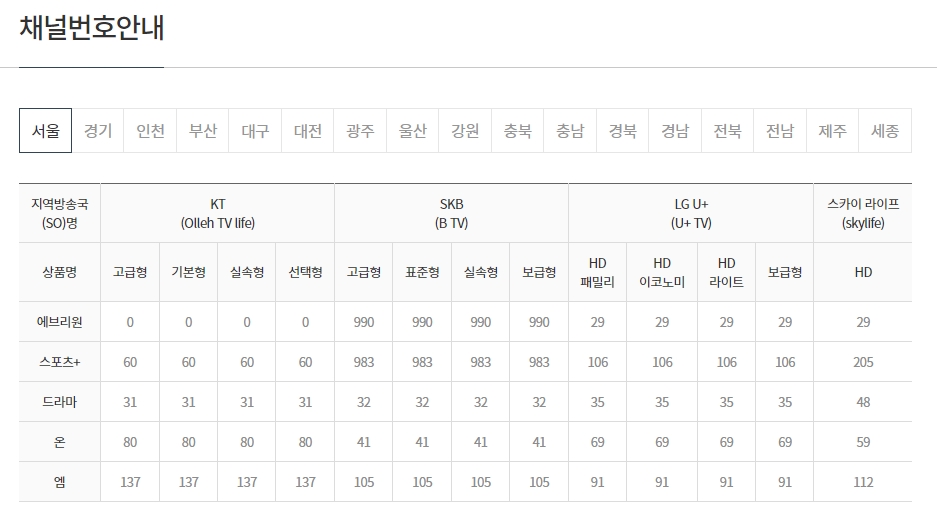 6. 경기 지역에서는 채널 번호가 더 다양합니다. 지역마다 다른 번호로 방송을 시청할 수 있습니다.